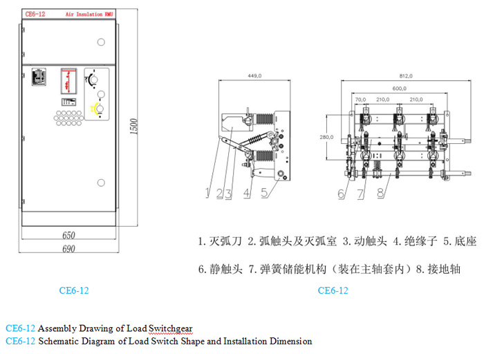 Load switch is composed of support frame, insulator, dynamic and static contacts, arc extinguishing knife, arc extinguishing device, transmission mechanism, etc. Load switch plus fuse combination is composed of load switch part, fuse, spring energy storage mechanism, etc. Grounding switch can be integrated with load switch and fuse combination, and has interlocking function with load switch.